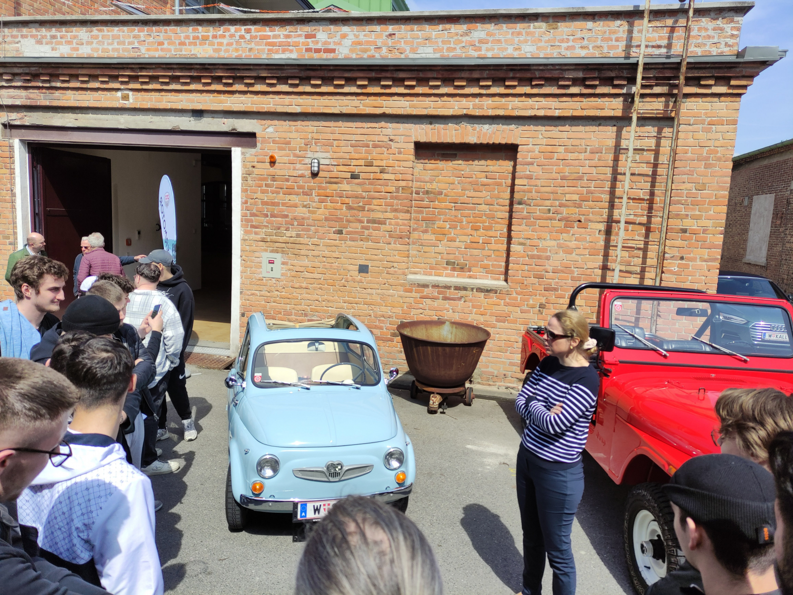 Danach wurde es schon sehr aufregend, als die jugendlichen, wie immer unter Aufsicht und Anleitung, die historischen Fahrzeuge zunächst nur starten durften. Die Mitfahrgelegenheit war sehr willkommen und so mancher „wilde Kerl“ fand sich mit lautem Lachen anfangs noch am Beifahrersitz unter anderem eines Puch 650 T wieder. Überall wurden Handy Videos zur Erinnerung gemacht. Danach durften die Schüler, wie es das Konzept von StarterMotor unbedingt vorsieht, auch mit den Autos fahren. Die Begeisterung war so groß, dass ein Schüler der HTL 1100 sofort um den Kauf des Puch 650 T zu verhandeln begann. Wer hätte so etwas erwartet? Leider ist er unverkäuflich. Alle waren ausnahmslos äußerst respektvoll mit den Autos, mussten oft eher behutsam hingeführt und ermutigt werden.